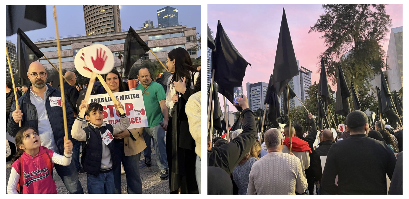 On Saturday night, January 31, the plaza was transformed by the arrival of over 140 busloads of families, young people, and elders from Israel’s towns and villages, where the majority of residents are Palestinian Arabs. All, including children, were dressed in black, carrying black flags and signs with blood-red handprints and the proclamation in Hebrew, Arabic, and English: Stop the Violence! Arab Lives Matter.